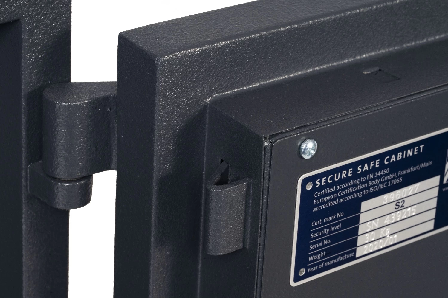 Превосходные защитные параметры сейфа гарантируются сертификатами соответствия международным стандартам: EN 14450 по устойчивости к взлому и EN 15659 по огнестойкости.